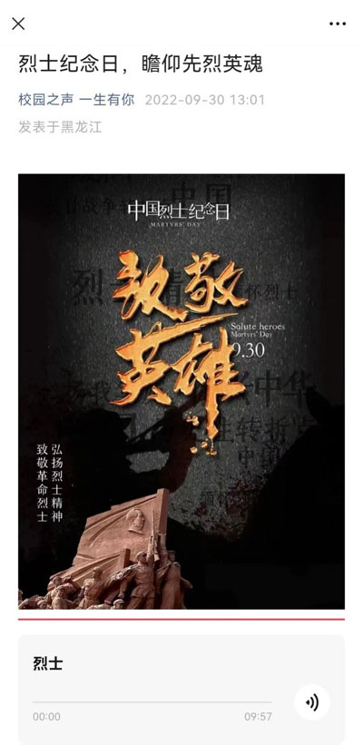 此外,学院团委和广播站还通过官方微信公众号发布了烈士纪念日相关内容。