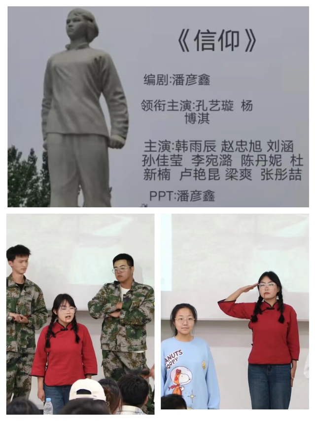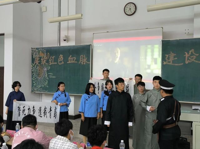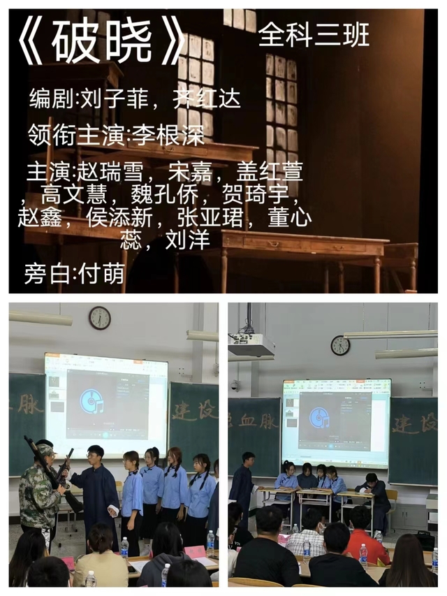 同学们通过话剧表演的形式,回顾党的百年奋斗之路,将大家拉回到战火年代,无数革命先烈在中国共产党的带领下,英勇奋战、保家卫国的场景,让红色精神深入到每一个人的心中。再现了确定毛泽东在党和红军领导地位的“遵义会议”;演绎了信念坚定不屈不挠的刘胡兰;回顾了《新青年》一声惊雷唤起思想解放的五四运动。同学们在话剧中出色的表演展现出了齐医学子的风采。