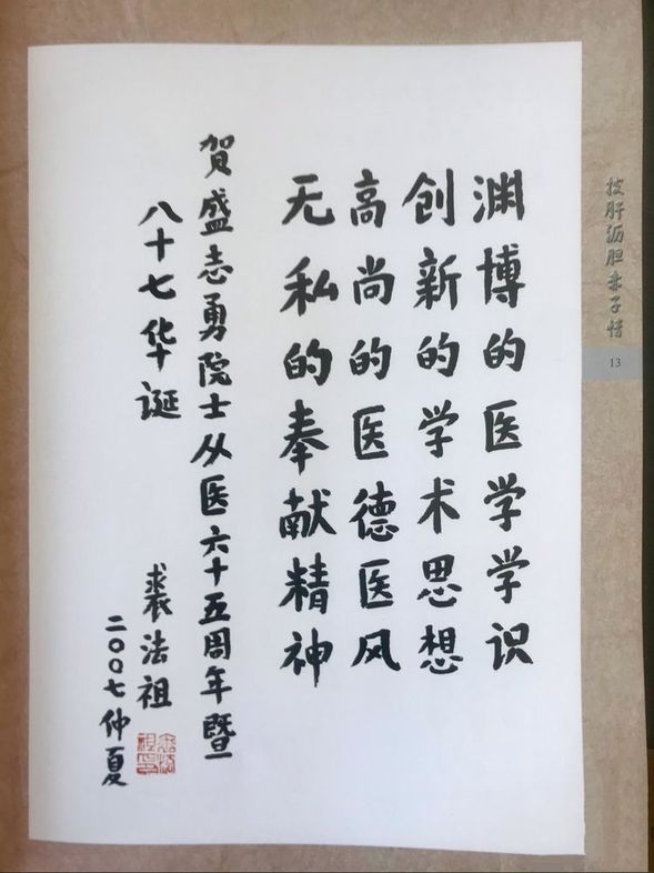 盛老将《披肝沥胆赤子情——一代宗师盛志勇院士从事医教研六十五周年纪念》画册赠予我院。