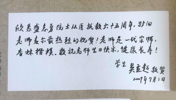 盛老为我院80年院庆题词:“落实科学发展观,努力创造一流医院,为提高人民健康水平做出新贡献。”