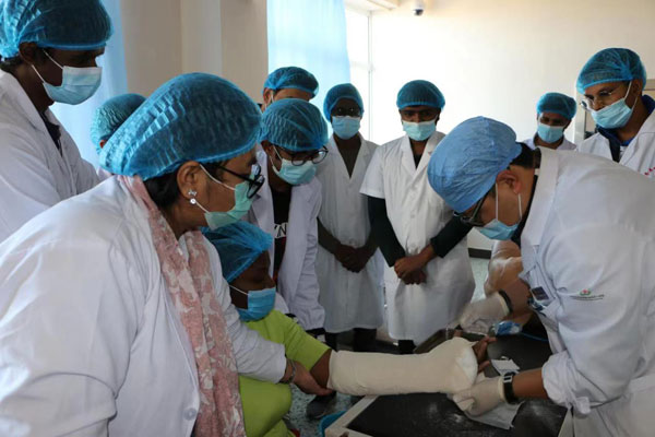 培训前,国际教育学院对培训安排和要求进行了详细部署。在临床教学中心的大力配合下,附属第二、第三医院的临床骨干教师在临床技能实验教学中心,对留学生开展了包括缝合打结、拆线换药、骨科固定、包扎等8个项目的培训。临床教师们准备了丰富的操作案例,认真讲解、精准示范;留学生们用心学习、积极提问,取得了良好的学习效果。