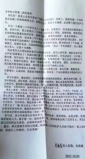 我本人就是一名医务工作者,自认为对病人认真、耐心、不训斥、不拒绝,但我从没有主动留过电话,不会一天几次的主动去看,更不会推心置腹的对他们讲那么多话。父亲病重,我们已经做了思想准备,医术再高架不住回天无力,但我感动于我们不在的日子里,他们真正做到了对病人如亲人。很多话,很多情景,历历在目,无法表达,看起来是小事,的确是小事,母亲经常和我们说,韩教授下班又去了一趟,张主任去了两次又说了啥,小护士今天怎么哄我父亲不要生气。在我母亲孤身陪伴,脆弱恐惧的时候,在我们远离家乡,焦虑无力的时候,是他们用善良的情怀深深地帮助了我们一家人。
