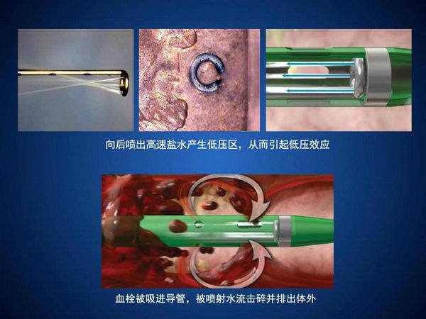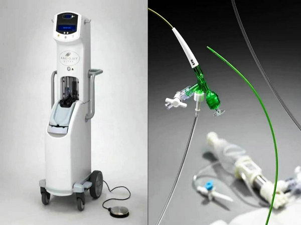 AngioJet血栓抽吸装置是机械血栓抽吸设备,运用了伯努利原理,仪器工作前,首先穿刺皮肤将导管置入形成血栓的血管,驱动泵随后产生脉冲压力将生理盐水经导管注入并从导管头端侧孔反向喷射冲刷血栓,高速生理盐水同时产生局部低压区,使碎裂的血栓颗粒经由导管排出孔吸出。AngioJet导管同时具有溶栓药物灌注功能,对于经冲刷后仍残留的血栓,可经导管脉冲式灌注溶栓药物,以促进溶解松动的血栓颗粒排出体外。