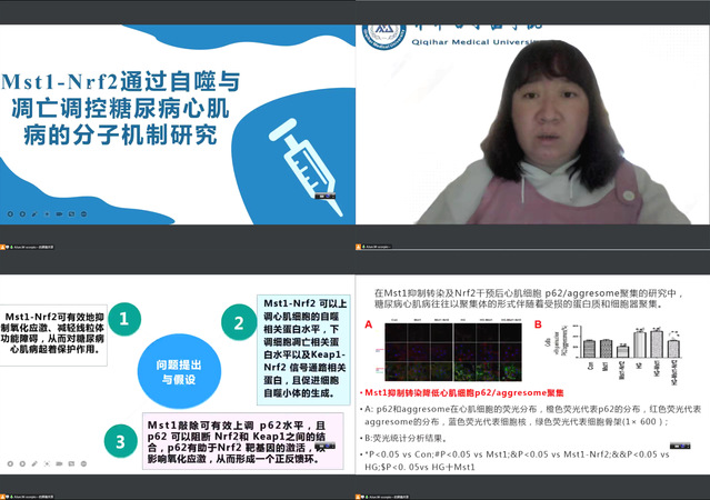 王珺博士以《Mst1-Nrf2通过自噬与凋亡调控糖尿病心肌病的分子机制研究》为题进行了汇报交流,详细介绍了国内外有关糖尿病心肌病研究领域的新进展,讲解了Mst1-Nrf2通过自噬与凋亡调控糖尿病心肌病的研究成果。与会教师就该课题影响调控的机制等问题展开了深入交流。