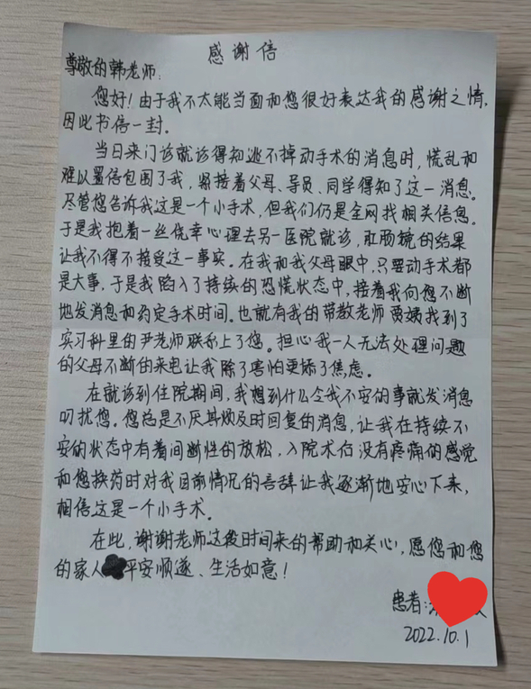 9月末,小秦来到医院看诊,在详细检查病情后确诊为“混合痔”。随后便安排她入院,准备手术。我院肛肠外科王钟焰主任和韩宇田医生为患者进行了无痛微创治疗痔疮,手术进展顺利,患者全程无疼痛感觉。成功完成手术回到病房的小秦感到非常惊奇,没想到这一次手术没有感受到太大的痛苦,而且仅用半个小时就顺利完成了。术后的换药康复阶段,也让她更加真切地感受到了无痛手术的好处。困扰小秦长达十年的痛苦得以解决,激动的小秦也手写了一封感谢信来表达感激之情。