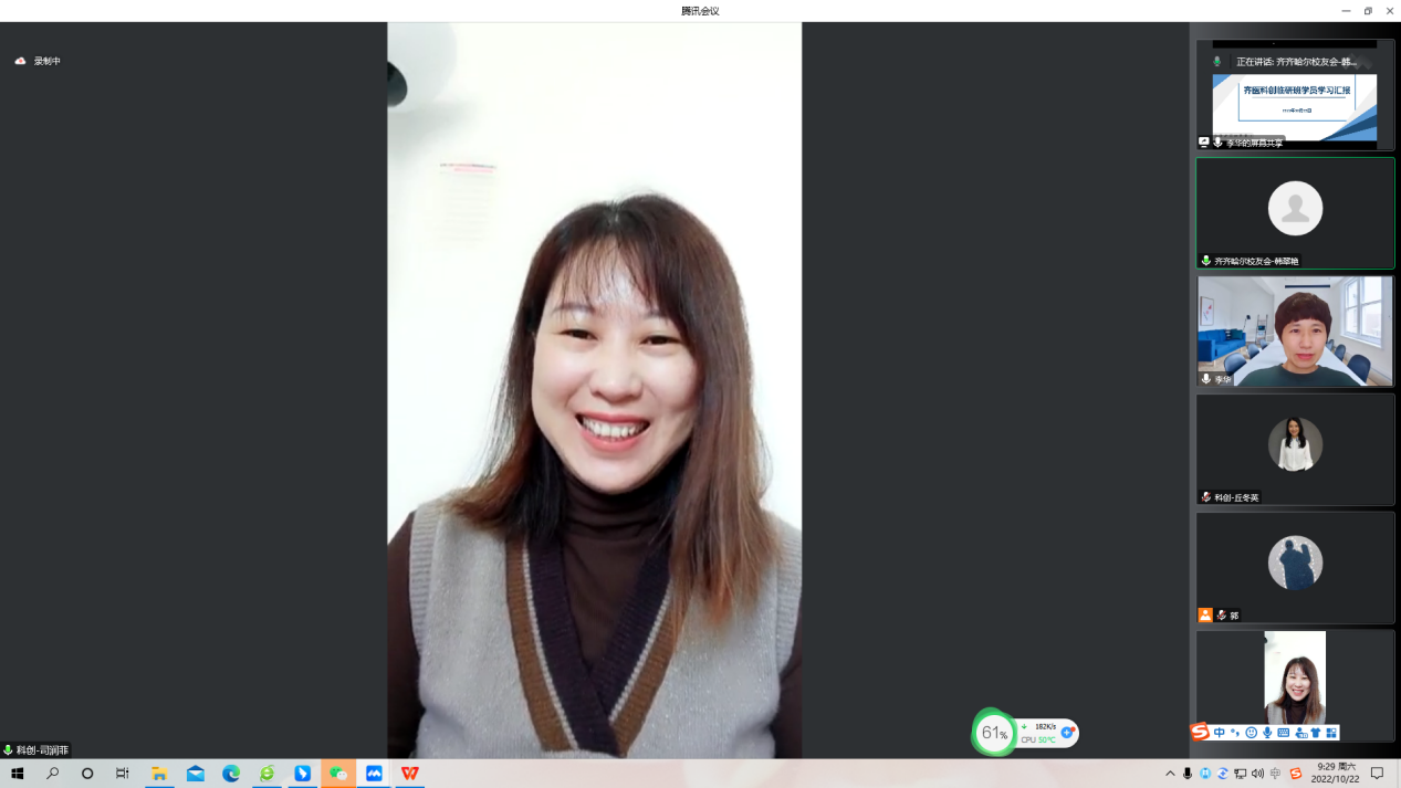 “齐医-科创临研班”第二期培训圆满结课,我院6名同学完成了为期两个月的临床研究协调员(CRC)岗位系统学习。为促进学校与企业深入了解学生的学习情况,我院学员于10月22日进行了线上学习汇报,此次参会人员包括药学院院长韩翠艳教授、教学副院长崔红霞教授、北京创力科创医药技术有限公司总经理丘冬英、北京创立科创医药技术开发有限公司人力总监司润菲、北京聚力临研科技有限公司总经理李华、北京聚力临研科技有限公司班主任郭婷及我院参加CRC岗位培训的学生,会议由李华总经理主持。