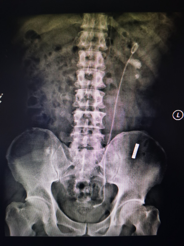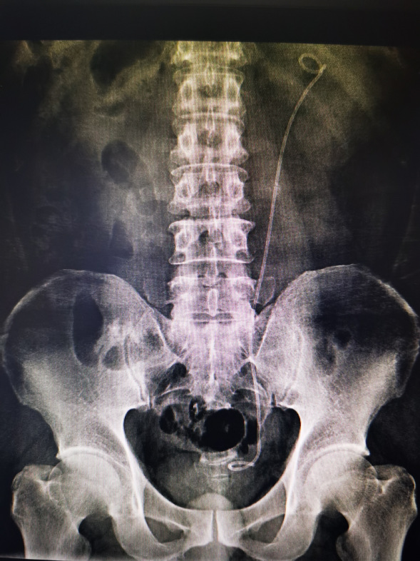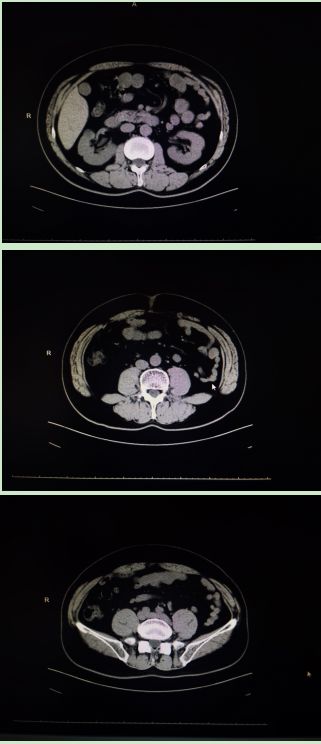 林先生,诊断:双侧输尿管上段结石并双肾积液。CT检查提示左输尿管上段结石约10*7mm,右输尿管上段结石约13*9mm。