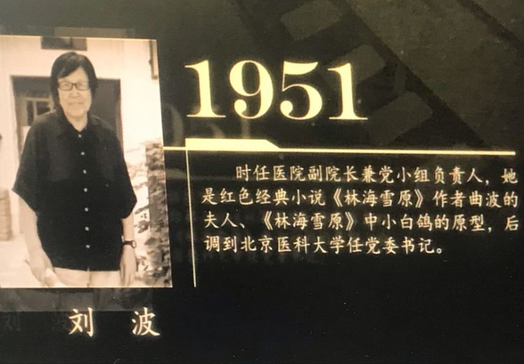 刘波,是我院第一任党组织(党小组)负责人,是红色经典小说《林海雪原》作者曲波的爱人,是小说中“小白鸽”的原型,后任北京医科大学党委书记。