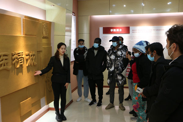 留学生们在校史馆讲解员的带领下进入校史陈列展区,从“创业、奋斗、发展”三个阶段了解了学校建校76年来的历史沿革和发展成就,对齐医的办学情况、文化积淀和历史底蕴,以及“大学至善、大医精诚”的齐医校训有了更深刻的理解。留学生们表示,通过参观学习,为齐医各个时期在人才培养、科学研究、社会服务、文化传承创新、国际交流合作等方面取得的成绩深感骄傲,增添了他们对学校和医学专业的热爱之情,也更加坚定了他们秉承学院优良学风、心怀梦想努力奋斗的信心和决心。