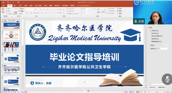 为促进毕业论文和毕业实习实践教学环节相结合,充分利用实习基地条件,增加实习基地本科毕业课题来源,提高基地毕业论文指导水平,11月3日下午,公共卫生学院副院长白丽教授线上为我院实习基地(北京体检中心)开展题为《毕业论文指导培训》的专题培训讲座,体检中心技术骨干人员参加了本次讲座。