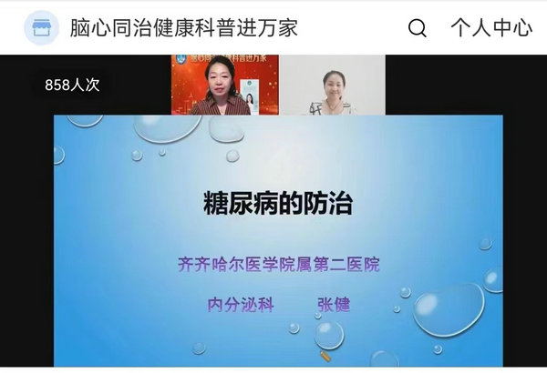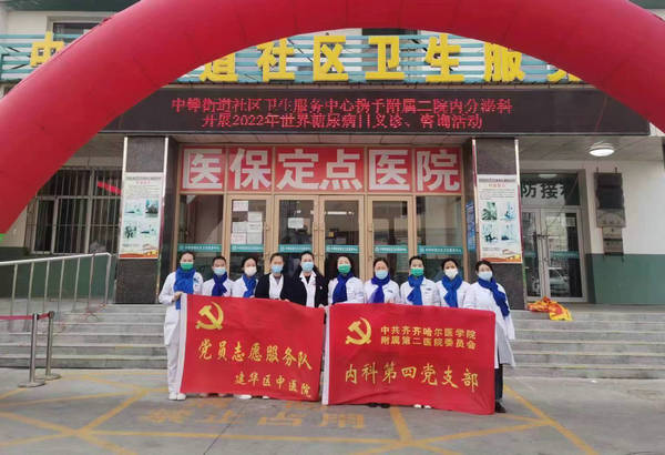 多年来,齐齐哈尔市健康教育协会糖尿病分会主任委员、齐医附属二院内分泌科一病区主任张健教授带领全体会员及医院内科第四党支部积极履行社会责任,广泛宣传糖尿病防治知识,切实提高广大居民对糖尿病防治重要性的认识,在做好新冠肺炎疫情防控常态化的同时,以“联合国糖尿病”义诊宣传日为契机,充分发挥医疗卫生机构作用,将优质、便捷、有效的医疗服务送到糖尿病患者身边,为齐齐哈尔市糖尿病防治工作贡献力量。