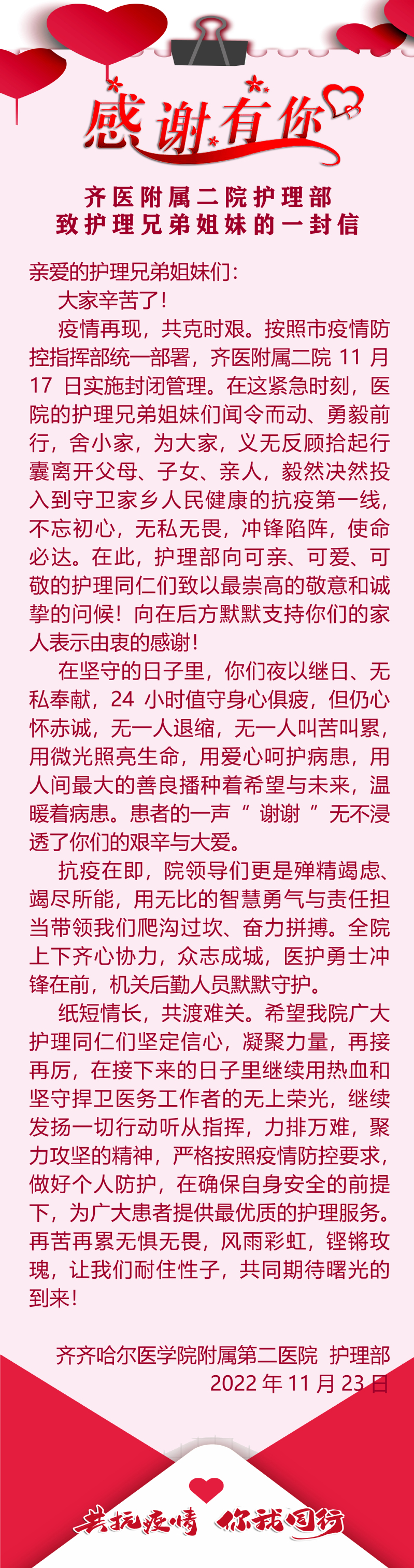 【附属二院】感谢有你—齐医附属二院护理部致护理兄弟姐妹的一封信