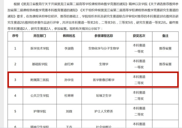 今天成绩的取得离不开影像教研室多年来对教师的精心培养,也离不开孙学佳的自身努力及扎实的教学基本功。我院会以此次竞赛为契机,继续探索专业课课程思政教学的有效途径和方法,落实立德树人根本任务,进一步提升我院教师课程思政能力。