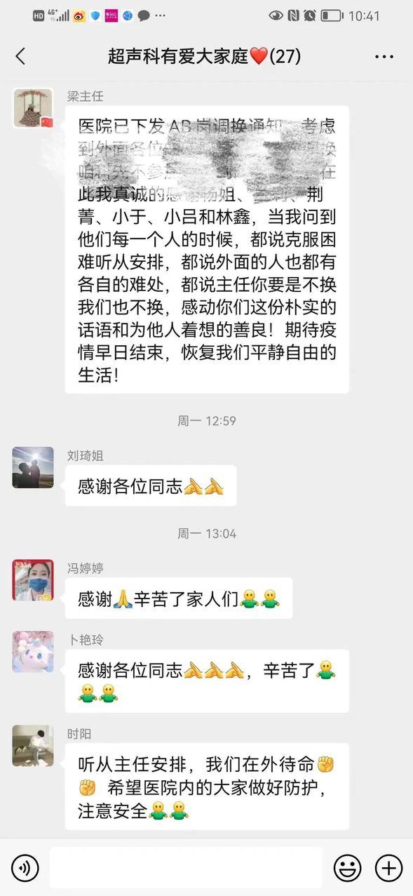 11月21日医院通知A、B岗调换,超声科主任梁笑考虑院外的人员也都各自有难处,当问到A岗的每一位同志是否有困难时,大家都说可以克服、可以继续坚持!超声科是一个有爱的大家庭,在这里我们能感受到家一般的温暖!