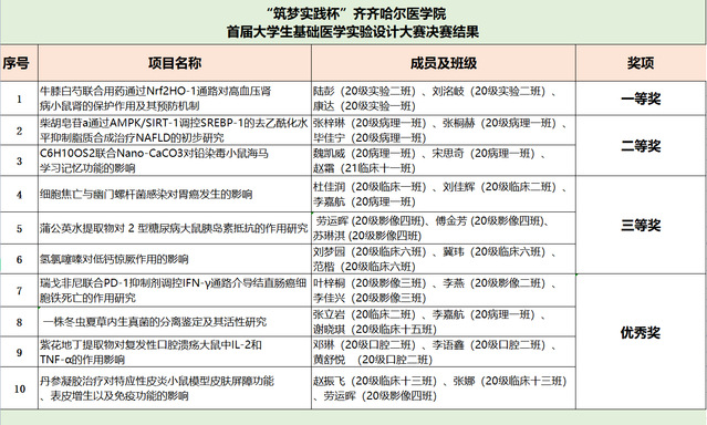 为进一步提高我院学生的创新性实验技能和科研思维能力,培养具有实践能力和创新精神的优秀医学人才。12月1日,“筑梦实践杯”齐齐哈尔医学院首届大学生基础医学实验设计大赛在线上举行。基础医学院的林岩教授、沈雷教授、王玉教授、朱坤杰教授、金海峰副教授、文丽波副教授以及药学院的林宇教授组成了专家评审组。