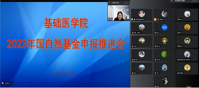 为进一步提高教师科研实力,有效提高国家自然科学基金项目申报质量和资助成功率, 12月1日,基础医学院通过腾讯会议平台召开2023年国家自然科学基金项目申报工作推进会,会议由沈雷副院长主持,林岩院长及基础医学院2023年拟申报国自然项目负责人参加会议。
