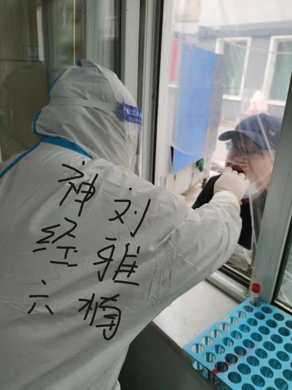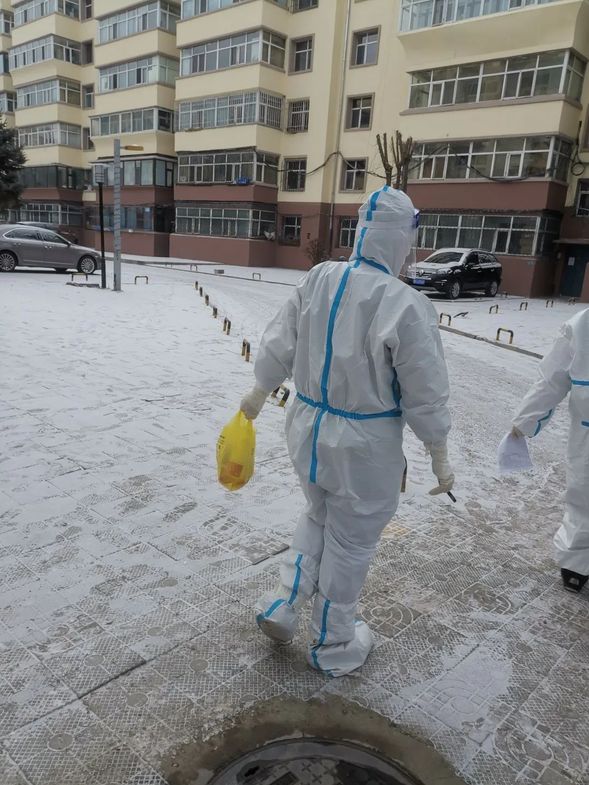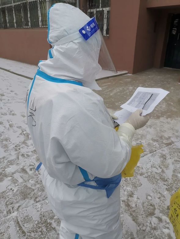 正值寒冬时节,连续十多日的核酸采样工作从未停歇。频繁的操作使队员们的手都冻僵了,脱下手套的那一刻都是又红又肿,管控人员的核酸采样工作需要上门入户完成,队员们身穿二级防护,背着各种消杀用品和采集用品,一层一层、一栋一栋地爬楼,一上午下来就是汗流浃背,脱下防护服的那一刻,身体被冷风吹得透心凉。队员们无一人抱怨,带病坚持,甚至在工作中出现晕厥也绝不退缩。队员们除了保质保量地完成核酸采样工作,还对社区人员进行疫情防控和个人防护进行指导培训,共同解决社区内存在的不规范问题。