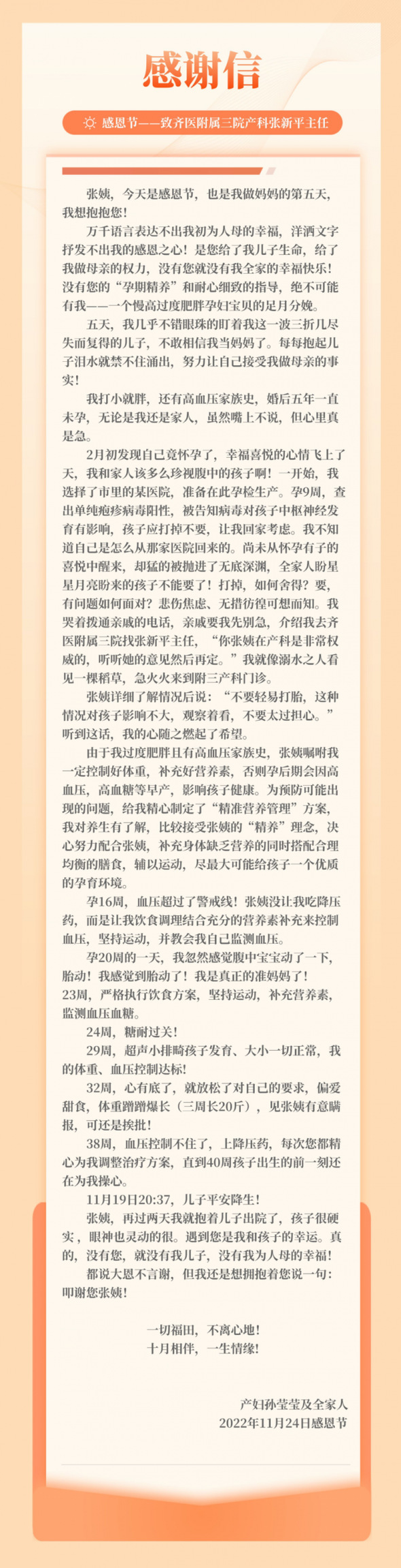 城市可以静默,但新的生命流动不止。11月19日20:37,一名健康的宝宝在我院产科降生。孕妇孙女士在怀孕初期,通过孕检检出单纯疱疹病毒阳性。了解到病毒可能对孩子中枢神经发育有影响,这让孙女士一度陷入了自责和彷徨。正在犹豫要不要打掉孩子的时候,我院产科张新平主任向孙女士耐心讲解病毒可能对孩子的影响并不会太大,并细心安慰鼓励孙女士留下孩子。正是张新平主任的这番话,让孙女士重新燃起了希望。由于产妇过度肥胖且有高血压家族史,所以在接下来的孕期治疗中,张新平主任为其制定了“精准营养管理”方案。产科主任张新平带领科室全体医护人员本着“生命至上”的原则坚守岗位,夜以继日守护着母婴健康。最终,宝宝平安出生,孙女士对张新平主任激动的说:“遇到您是我和孩子的幸运。真的,没有您,就没有我儿子,没有我为人母的幸福!”孙女士还写了一封感谢信,在感恩节那天送给了张新平主任,以此感谢产科全体医护人员对她的照顾和付出。