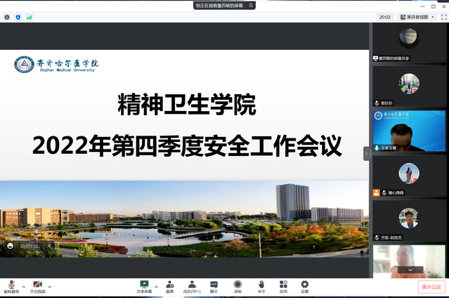为进一步认真贯彻落实习近平总书记关于安全生产的重要指示批示精神及学校2022年第四季度安全工作会议精神,做好学院各项安全工作,确保假前和假期各项工作平稳安全运行,12月8日下午,精神卫生学院以腾讯会议的方式召开了第四季度安全工作会议,会议由副院长李成冲主持,全院教职工参加了会议。