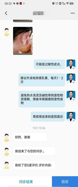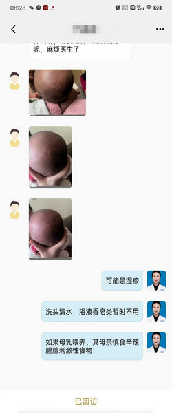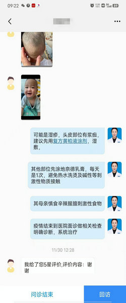 线上就诊的某一天,一位患儿家长的问诊,引起了皮肤科王永琴主任的注意,因疫情原因市内各医院皮肤科门诊始终没有开诊,患儿年龄较小,无法表述症状,且皮疹面积大伴有渗出,患儿家长非常着急,王主任凭借着家长传的图片结合皮疹,给予了初步诊断和基础常规用药,并告知了患儿家长患儿日常生活中需要的注意事项,且患儿是母乳喂养,王主任又耐心的告知了患儿家长饮食及起居上的要求。患儿家长表达了对王永琴主任的感谢。