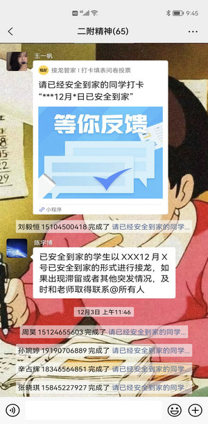 第一批学生离校当天,大巴车从凌晨4:30分开始到晚上18:30分,5各批次接送学生去两站一场,离校前学生科副科长才艳雪为学生召开了线上班会,告知学生返乡注意事项和怎样科学防护。学生离校前医院给每名学生发放N95口罩,辅导员及时获取学生的行程轨迹,帮助学生解决困难和问题,切实做到“离校不离线,服务不断线”;学生到家后第一时间给学院“报平安”,学生和家长纷纷留言致谢,家校连心、携手共育,共同做好寒假学生管理工作。