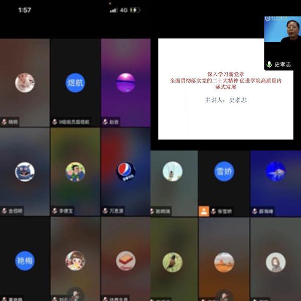 史孝志书记以《深入学习新党章 全面贯彻落实党的二十大精神 促进学院高质量内涵式发展》为题,从“全面深刻领会党的二十大精神实质、全面深入学习二十大新党章、全面促进学院高质量内涵式发展三个方面进行了深入讲解。史孝志书记强调,要紧密联系学院改革和发展实际,抓好党的二十大精神的贯彻落实,以党的二十大精神引领学院高质量发展,引领教师修身、治学、育人,当好学生成长的引路人。参会教师表示,将深入贯彻落实党的二十大精神,始终站在“教育是国之大计、党之大计”的政治高度,坚持立德树人使命,促进学院高质量内涵式发展,努力培养堪当民族复兴重任的时代新人。