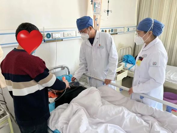 神经外一科主任张艳国刚刚退烧,仍然心系患者,带领护士齐亚莹为脑出血患者查房,观察患者病情。