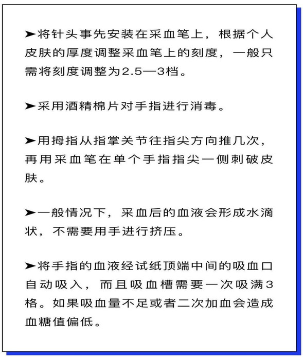 (1)用温水或中性肥皂洗净双手,反复搓揉采血的手指,直至血运丰富;扎手指测血糖前没有洗干净手指,不但容易感染,还可能会导致结果不准。比如刚吃完橘子后测血糖,血糖会偏高,这是因为指尖血混入了橘子所含的糖分。另外需等手干燥后再取血,否则残留的酒精或水分会影响测试结果。消毒不宜采用含碘消毒剂,因为碘酒酶发生反应,会产生误差。