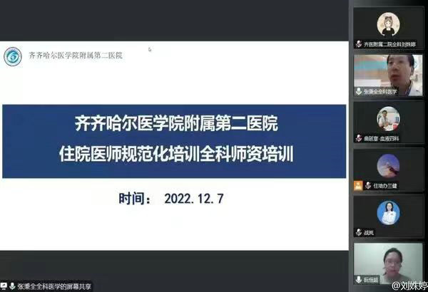 12月5-10日,齐医附属二院举办了线上2022年全科住院医师规范化师资培训班,来自首都医科大学郭爱民教授、北京大学第一医院王颖教授、浙江大学附属邵逸夫医院方力争教授、浙大医学院阮恒超教授、中山大学附属第三医院崔小川教授、南京医科大学附属无锡人民医院黎尚荣教授、南京医科大学附属苏州市立医院黄敏教授、哈尔滨医科大学附属第二医院孟佳主任8位全国著名全科领域专家应邀莅会讲学,齐医附属二院全科医学科主任、全科专业基地主任张秉全教授主持会议,11场培训共吸引了省内外近千名医学同仁入线培训。