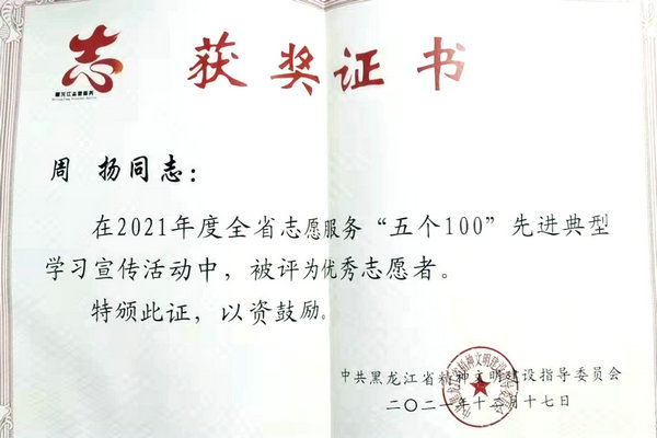 7、周扬主任荣获全省志愿服务“五个100”先进典型“优秀志愿者”。