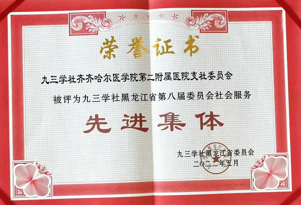 4、九三学社齐医附属二院支社委员会荣获九三学社省第八届委员会社会服务“先进集体”荣誉称号。