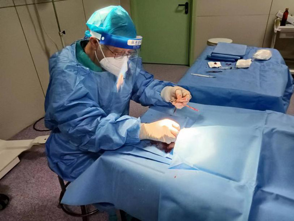 急诊外科主任郭金刚和医生杨威为患者缝合伤口