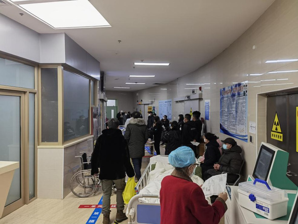 住院综合楼CT室候诊走廊,排队等待检查的患者人山人海