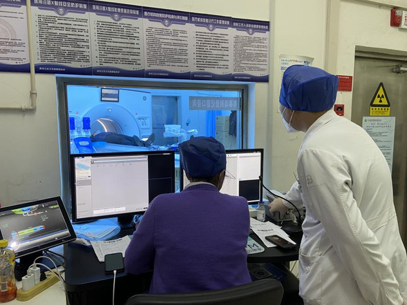 住院综合楼CT室医技人员等待患者摆正体位后为其进行CT检查