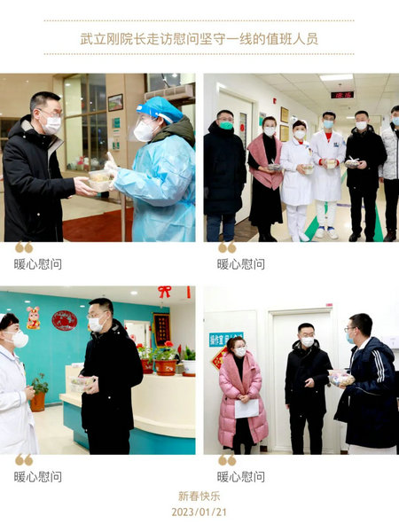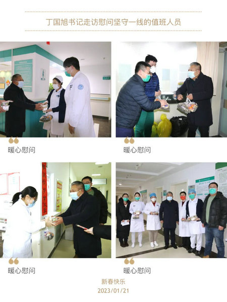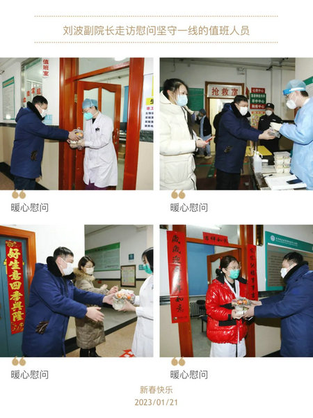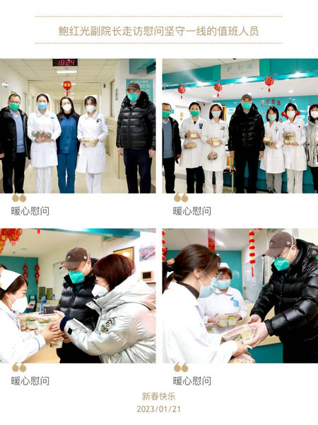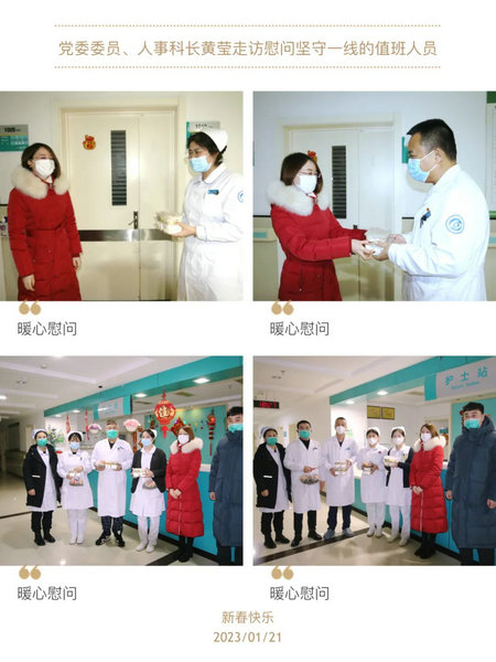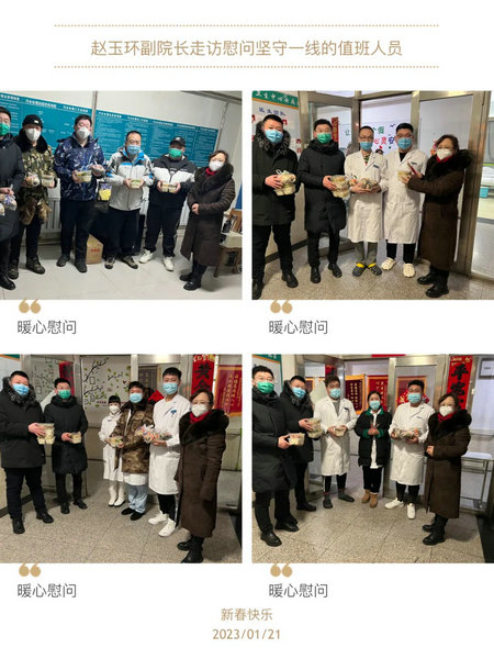 除夕夜晚华灯初上、鞭炮齐鸣,在这举国欢庆、万家团圆之际,党委书记丁国旭、院长、党委副书记武立刚、副院长鲍红光、赵玉环、刘波、党委委员、人事科长黄莹带领相关科室负责人深入工作一线,携带热气腾腾的年夜饺子、丰富的菜肴佳品及果品,走访慰问了坚守岗位的临床、医技、机关、后勤的全体值班人员。