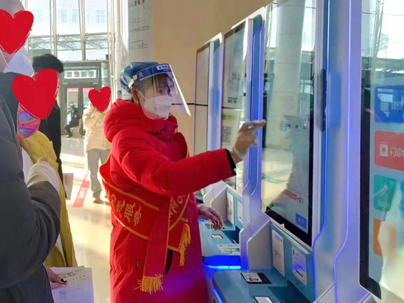 门诊大厅,“暖阳”服务队帮助市民通过院内智能自助服务机完成挂号、缴费、报告打印等操作,方便快捷,减少就诊等候时间。