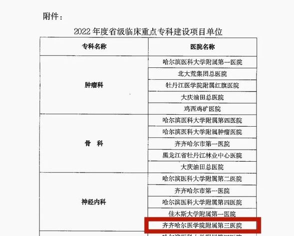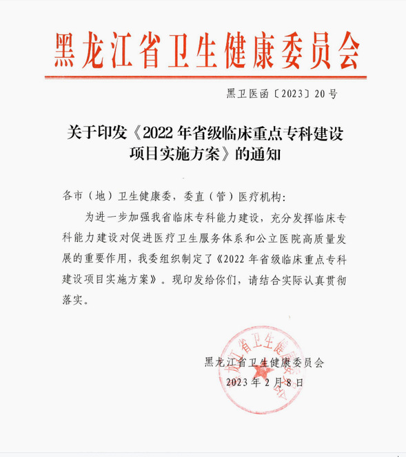 近日,黑龙江省卫生健康委员会发布《关于印发< 2022年省级临床重点专科建设项目实施方案>的通知》,公布了最新一批省级临床重点专科评审结果,经过层层遴选,我院神经内科成功获批省级临床重点专科建设项目。