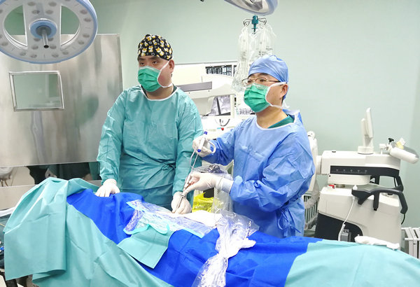 骨外科三病区副主任刘艳楠(右)为患者行腰椎间盘椎间孔镜下椎管解压术