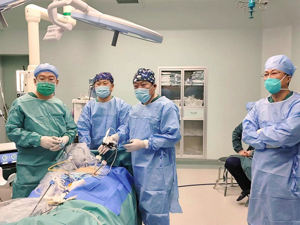 泌尿外科一病区主任刘涛(右二)等为患者行腹腔镜下膀胱根治性切除术