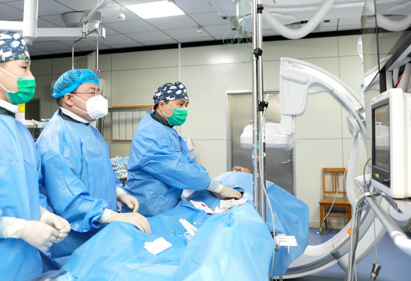 血管外科主任王颖(右一)等在行介入手术