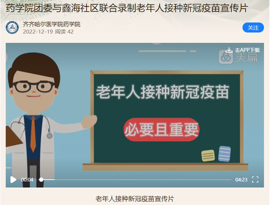 药学院团委在寒假期间就积极组织青年学生开展“小我融入大我 青春献给祖国”系列活动,与共建社区联合录制了老年人接种新冠疫苗宣传视频,组织青年学子在禁毒宣传、关爱留守儿童、致敬退役军人等方面开展了丰富多彩的志愿服务活动。
