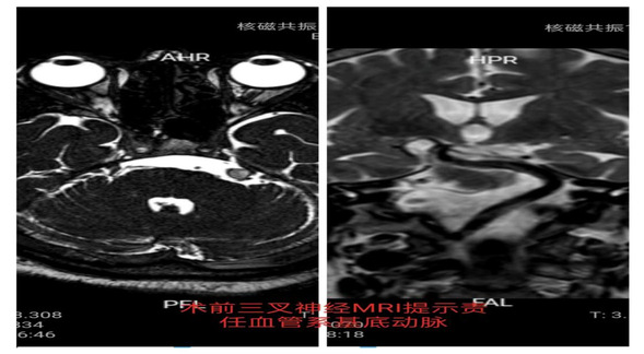 术前三叉神经MRI提示基底动脉移位压迫左侧三叉神经根部