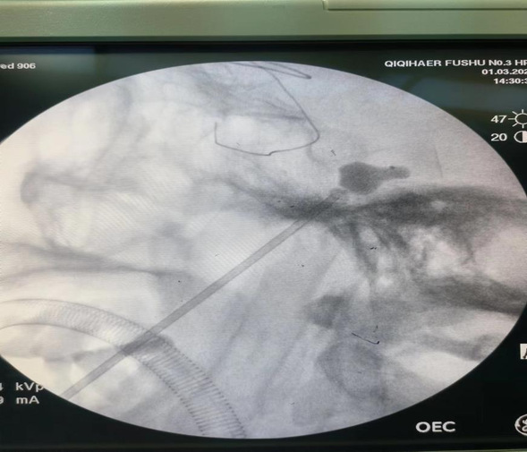 术中C型臂照相提示球囊呈梨形位于麦氏囊内,压迫2.5分钟,手术结束,总用时15分钟