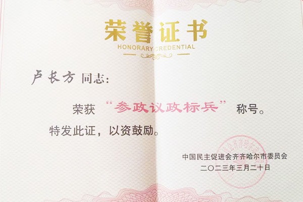 2022年,在民进齐齐哈尔市委,学院党委统战部的正确领导下,民进齐齐哈尔医学院支部主委卢长方带领全体会员,积极、深入开展参政议政、建言献策工作,在调研成果、提案建议、社情民意报送等各方面均取得了丰硕成果。支部全年共完成社情民意提案13个,其中卢长方主委执笔的《关于规范公共交通工具行驶的建议》得到市政协主要领导批示重点督办,并召开专门协调会,提交的《关于加强居民宪法知识普及的建议》作为代表性提案出现在市政协提案工作报告中,同时,向民进省委提交了《关于倡导红色教育,红色教育影视剧免费播放的建议》等提案2个。