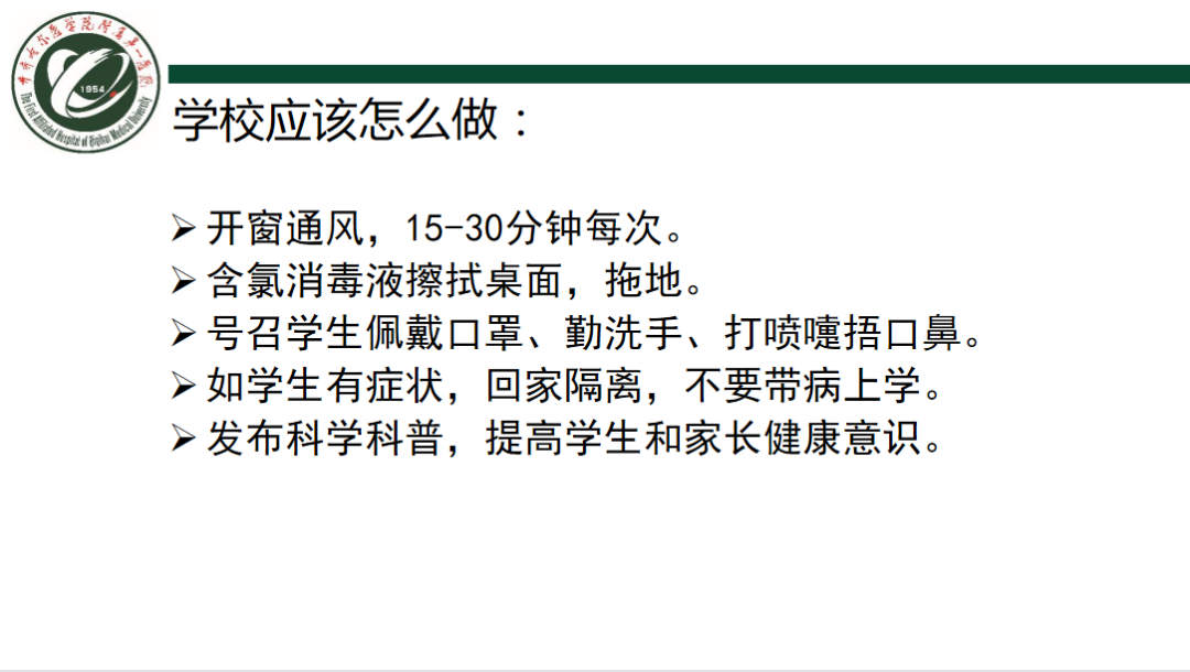 孙双滨表示,早诊断、早治疗是提高流感治愈率、降低病死率的关键;小朋友们要定期注射流感疫苗,勤洗手,勤漱口,不用脏手接触脸,眼,口等部位;尽量少去拥挤的公共场所,雾天外出戴口罩;注意咳嗽礼仪,避免传染他人。希望学校定期开窗通风,保持空气流通和清新,积极宣讲流感科普知识,打造健康良好的学习生活环境。