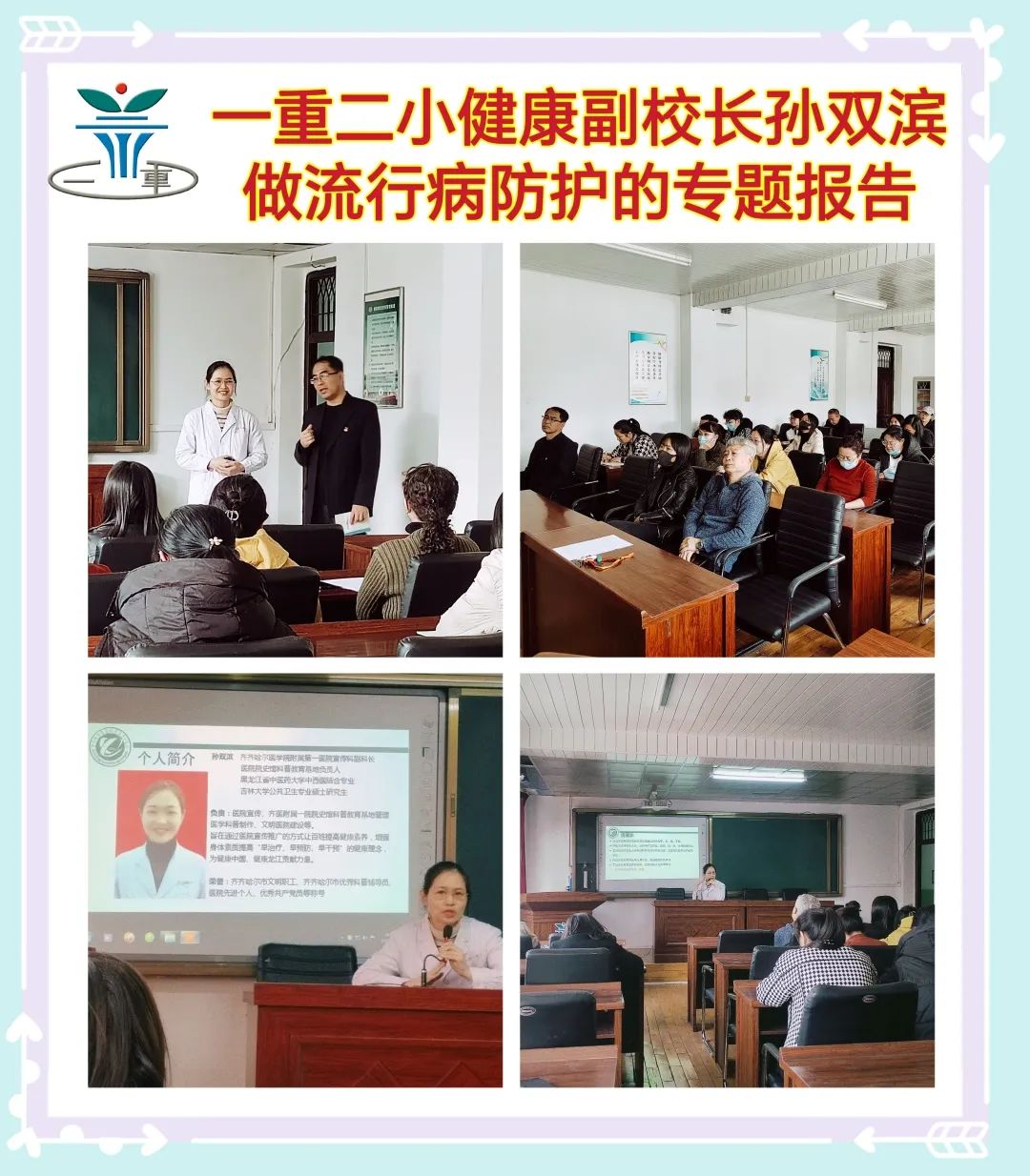 4月4日下午,齐医附属一院“齐齐哈尔市优秀科普辅导员”、院史馆科普教育基地负责人、一重二小健康副校长孙双滨到一重二小开展《流感的科普知识》宣讲,一重二小校长赵旸出席并主持培训,近60名教师在现场参加培训。