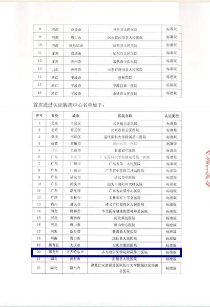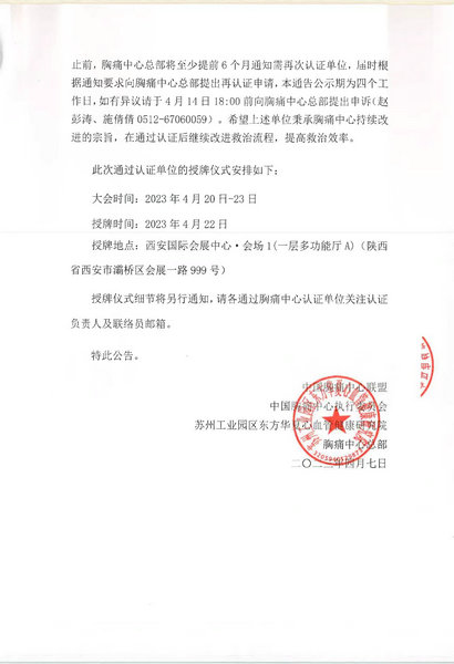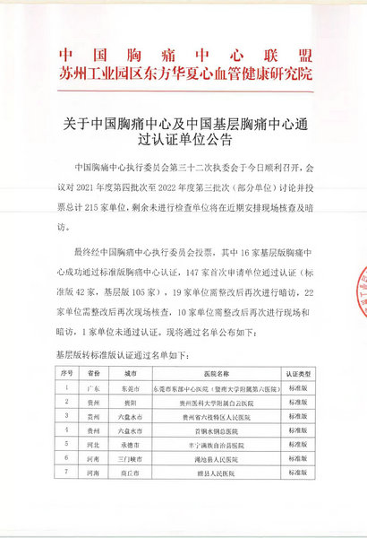 4月7日,中国胸痛中心联盟、中国胸痛中心执行委员会、苏州工业园区东方华夏心血管健康研究院联合发布了《关于中国胸痛中心及中国基层胸痛中心通过认证单位公告》,齐医附属二院首次申请顺利通过标准版认证,这标志着医院胸痛诊治能力和水平达到了国家先进,迈出了医院高质量内涵式发展更加坚实的一步。据悉,本次147家单位首次申请通过认证,其中标准版42家,基层版105家。