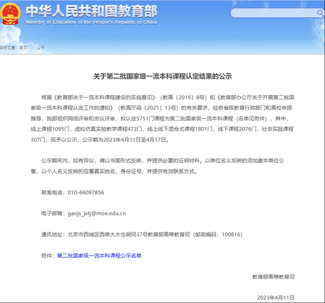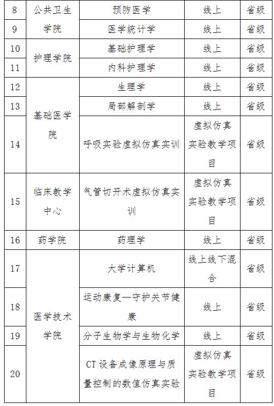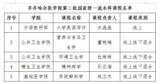 近日,从教育部网站《关于第二批国家级一流本科课程认定结果的公示》获悉,学院申报的5门课程全部获批第二批国家级一流本科课程!其中大学英语写作荣获线上一流课程,营养与食品卫生学、环境卫生学、精神病学、系统解剖学荣获线上线下混合式一流课程。