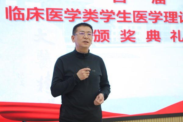 张可勇副院长在讲话中强调,教育教学质量是学校发展的生命线,学校始终坚持“以学生为中心”的理念,重视学生的职业素质、理论知识和执业能力培养,在学院资金紧张的情况下仍然投入大量资金改善教学条件、大力发展学科建设和研究生教育,以学科引领、促进本科教育教学质量的提升。他指出,“博学而后成医,厚德而后为医,谨慎而后行医”,他希望全校师生坚持“以赛促教、以赛促学、以赛促管、以赛促强”的理念,不断夯实医学基础知识,加强学风建设,推进医学教育创新发展,不断促进学生医学理论知识和临床工作能力的提升,让学生的知识在实践中闪光、让学生的技能在知识的引领下飞跃;他倡议学生们要高度重视理论知识和技能的学习,促进自身成长成才,为国家富强、民族昌盛和自己更美好的未来而努力奋斗。同时,他希望学院各教学单位以此次竞赛为契机,拓宽各单位之间的交流渠道,加强沟通合作、互通有无、取长补短,共同肩负起培养特色应用型医学人才的重任。