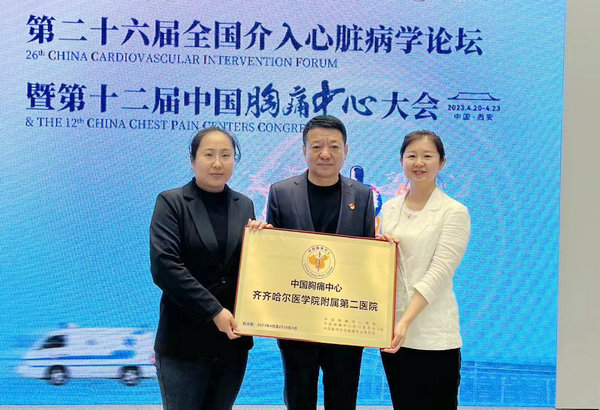 4月22日,中国胸痛中心联盟第二十六届全国介入心脏病学论坛暨第十二届中国胸痛中心大会在西安举行,齐医附属二院通过评审并接受中国胸痛中心总部授牌。心血管内科一病区(心脏康复)主任、胸痛中心医疗总监李春峰教授代表医院上台接受授牌,副主任、胸痛中心联络员薛探副教授,胸痛中心网报员张禹参加授牌仪式。